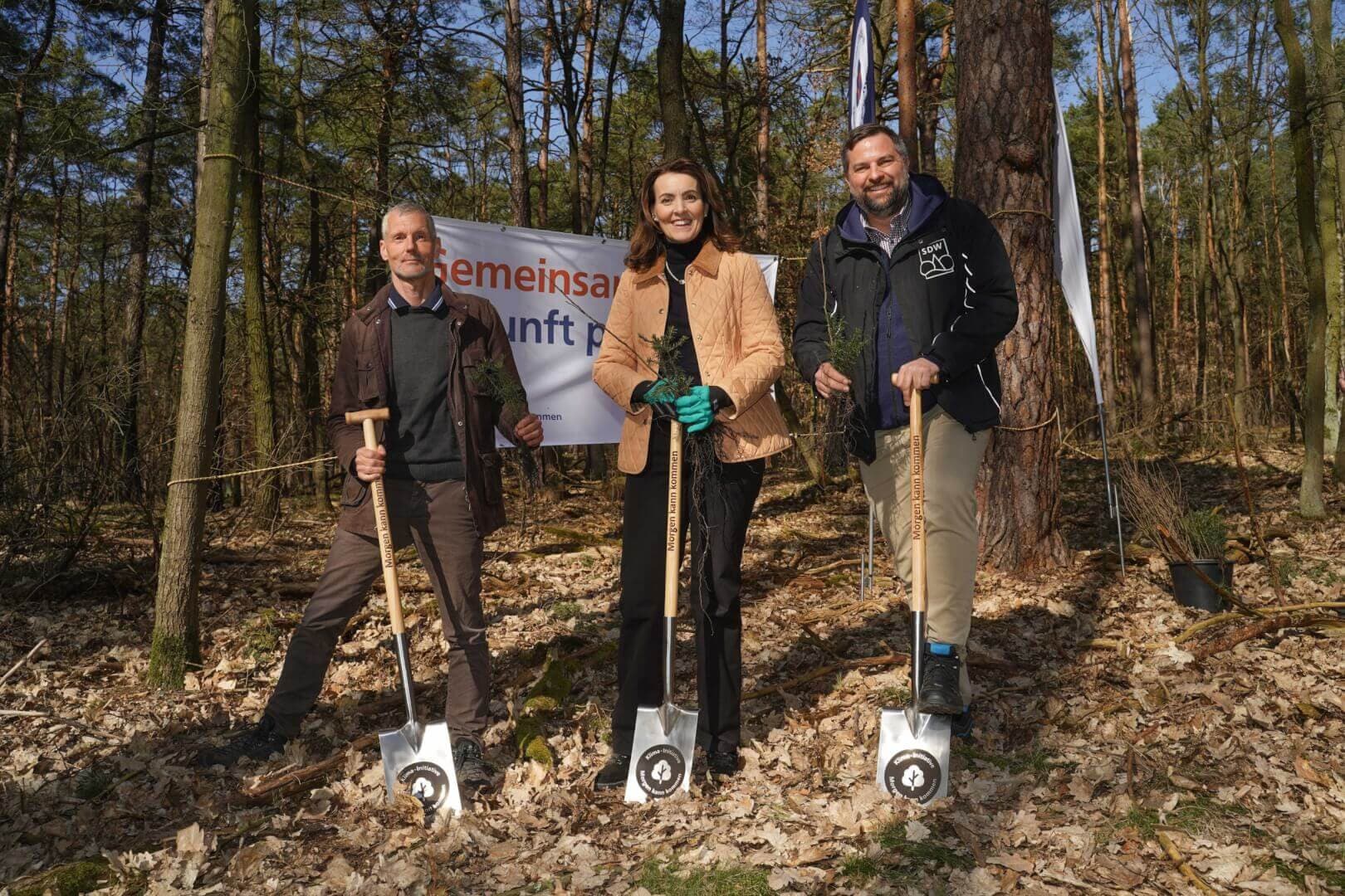 Marija Kolak, Präsidentin des Bundesverbandes der Deutschen Volksbanken und Raiffeisenbanken (BVR) setzte in Berlin-Gatow den Spaten gemeinsam mit Christoph Rullmann, Bundesgeschäftsführer der Schutzgemeinschaft Deutscher Wald e. V. (SDW) an. Begleitet wurden sie dabei unter anderem von Dr. Eckhard Heuer, Referatsleiter Nationale Waldpolitik beim Bundesministerium für Ernährung und Landwirtschaft. Er erläuterte die Situation des deutschen Waldes und betonte die Wichtigkeit solcher partnerschaftlichen Initiativen: „Die Wälder leiden unter dem Klimawandel. Das zeigen deutlich die Waldschäden der letzten Jahre infolge der Dürren. Bund und Länder haben beträchtliche finanzielle Mittel bereitgestellt, um die Schadflächen wieder zu bewalden. Die Initiative, mit der die SDW sowie Volksbanken Raiffeisenbanken gemeinsam beim Aufbau von klimaresilienten Mischwäldern helfen, begrüße ich sehr und freue mich über das Engagement.“